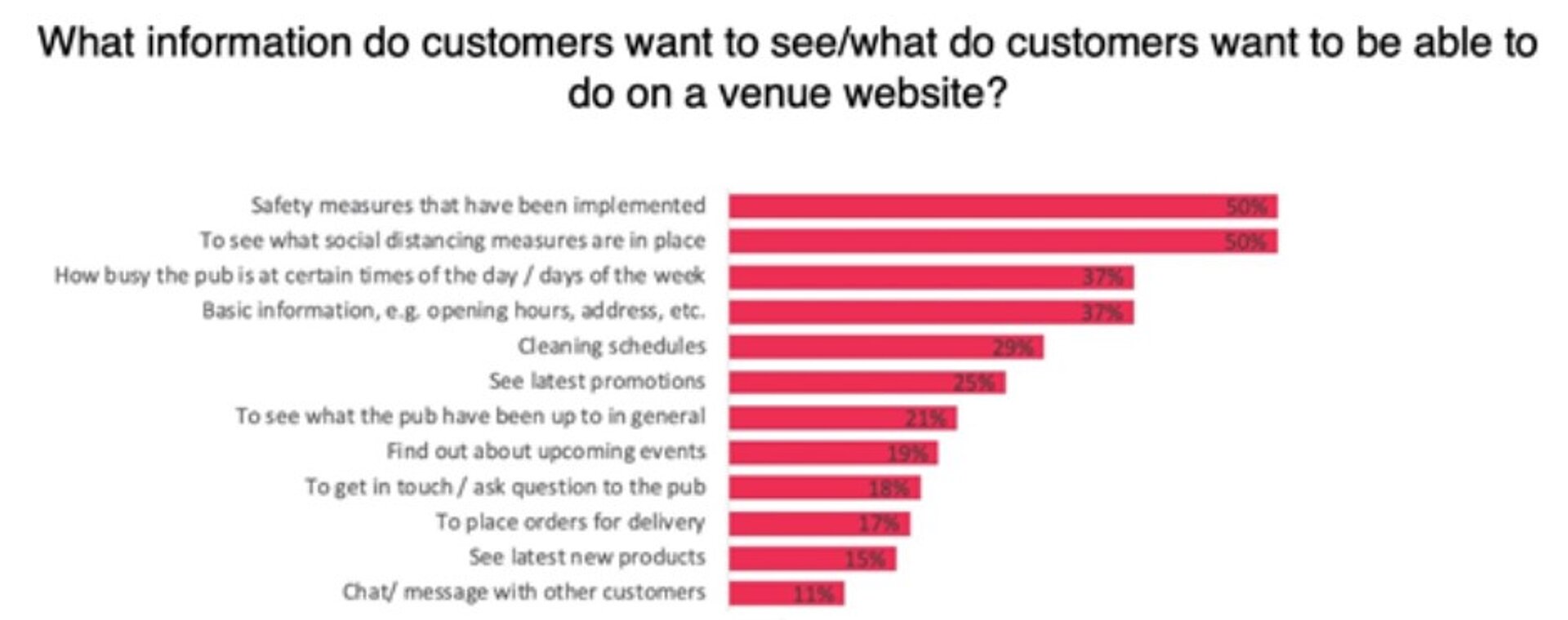 According to KAM Media - the hospitality and grocery retail research media company - in August 2020, the top two pieces of information that British customers expected to see on websites when choosing where to eat and drink were safety, followed by social distancing measures implemented by venues. See below for the full breakdown: