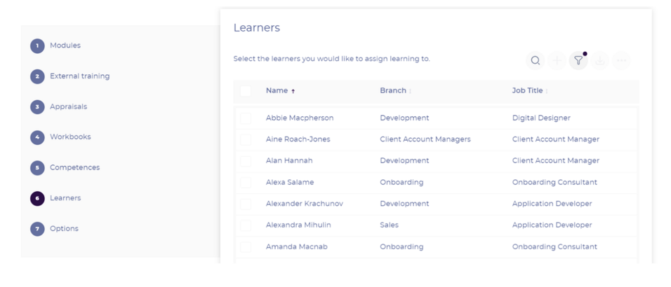 - Click on Learners on the navigation bar of the Assign Learning tool and select which members of your team you’d like to assign to.