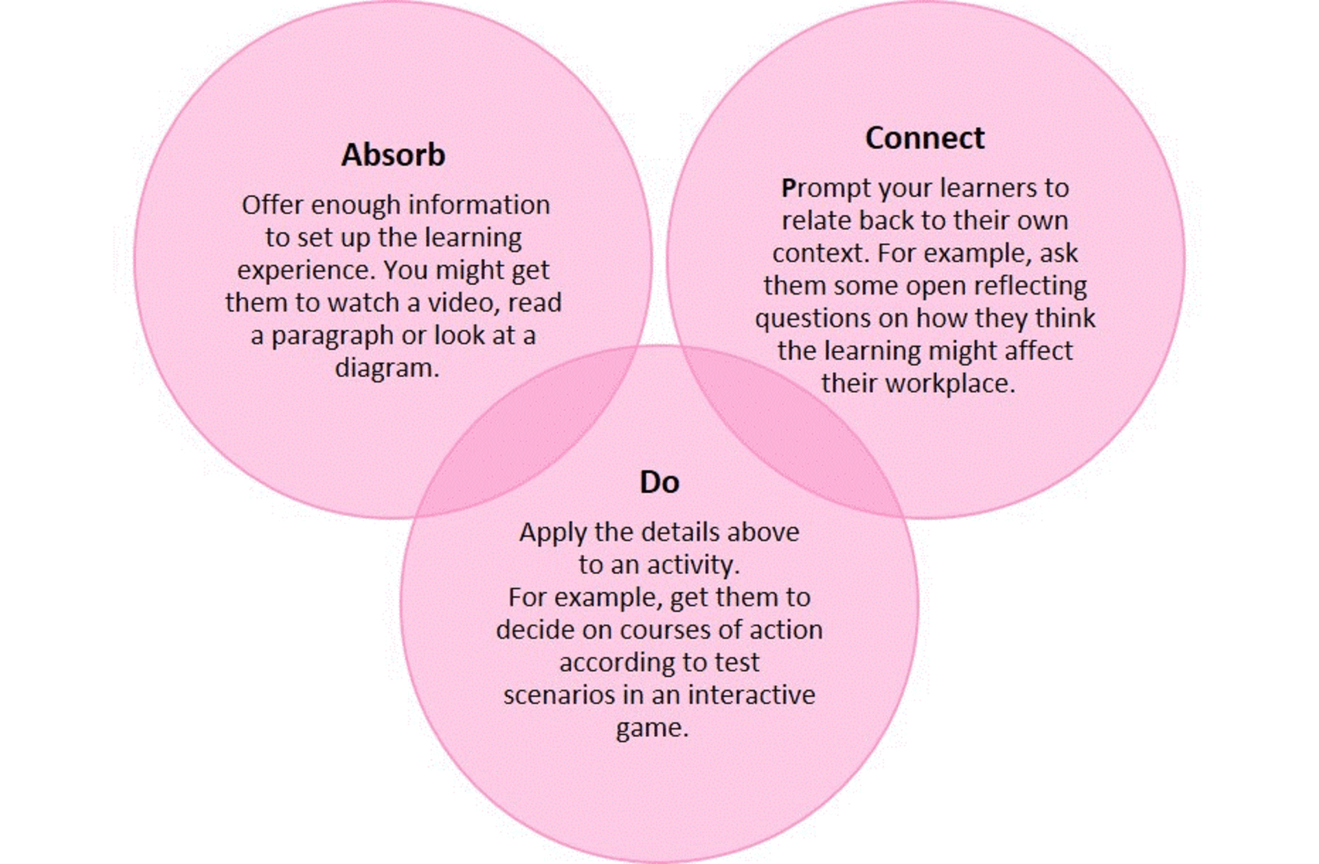 Let’s take a closer look at Step 3 – Practice Activities. Practice activities can take various forms online. Start by thinking about this 3-step process: Absorb, Do, Connect.