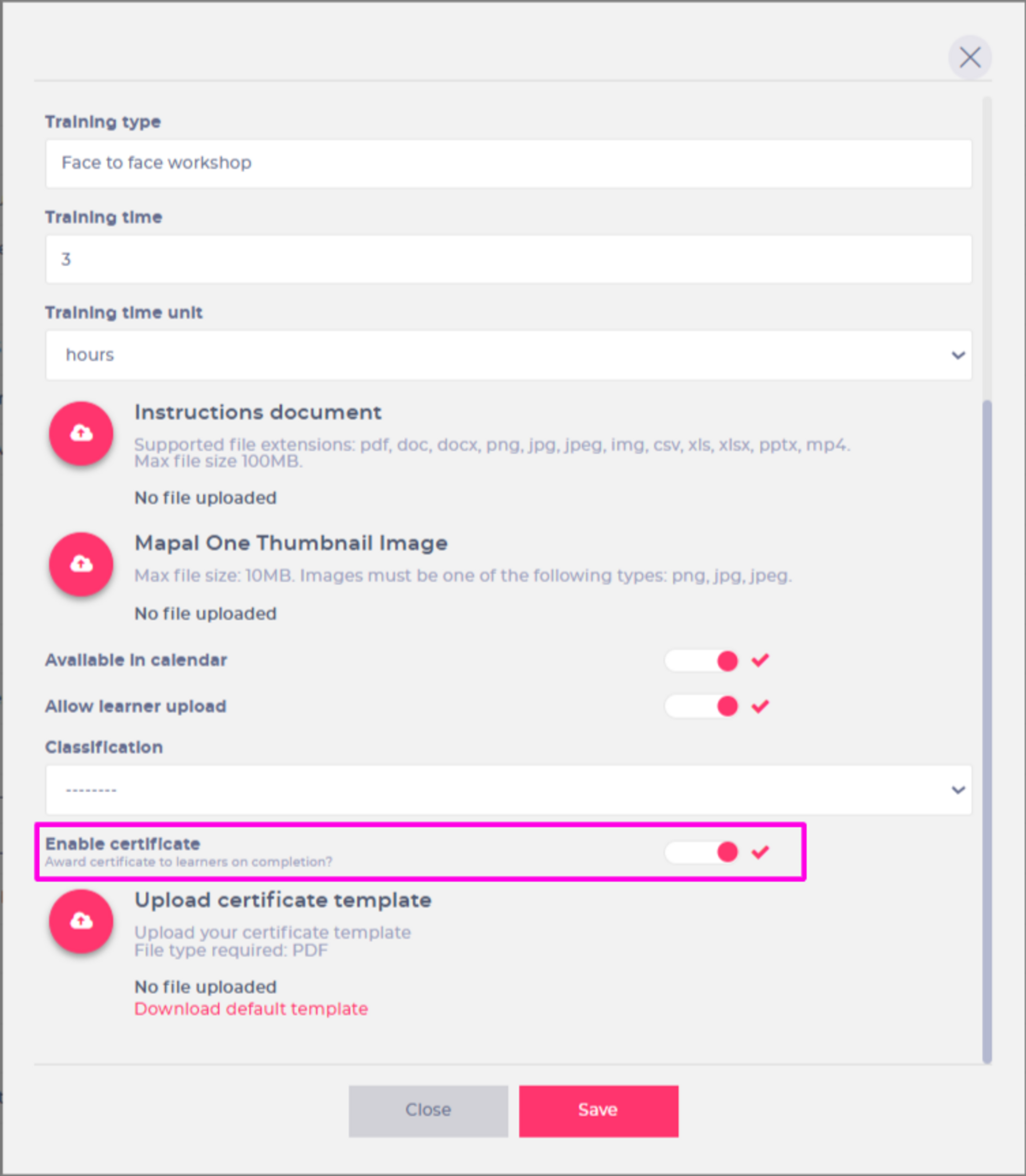 We’ve introduced the ability to enable certificates for External Training items, so they’re automatically generated on completion.