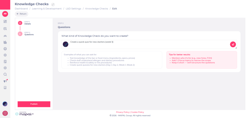 Creating Knowledge Checks manually can take time, particularly when building multiple questions across different topics. AI Assisted Knowledge Check Creation speeds up the process by generating an initial set of questions from a simple prompt, while still allowing users to refine and customise the final content.