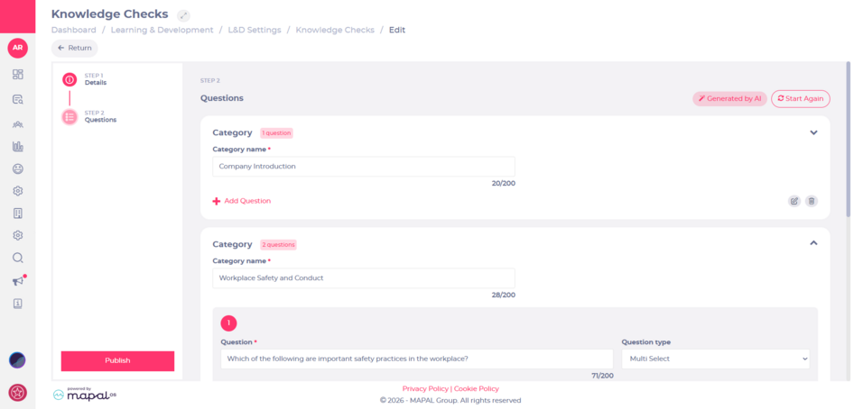 When creating a new Knowledge Check, users can choose to build questions manually or generate them using AI. After providing a prompt and selecting the desired question types, AI generates a structured set of questions that can be reviewed and edited before publishing.