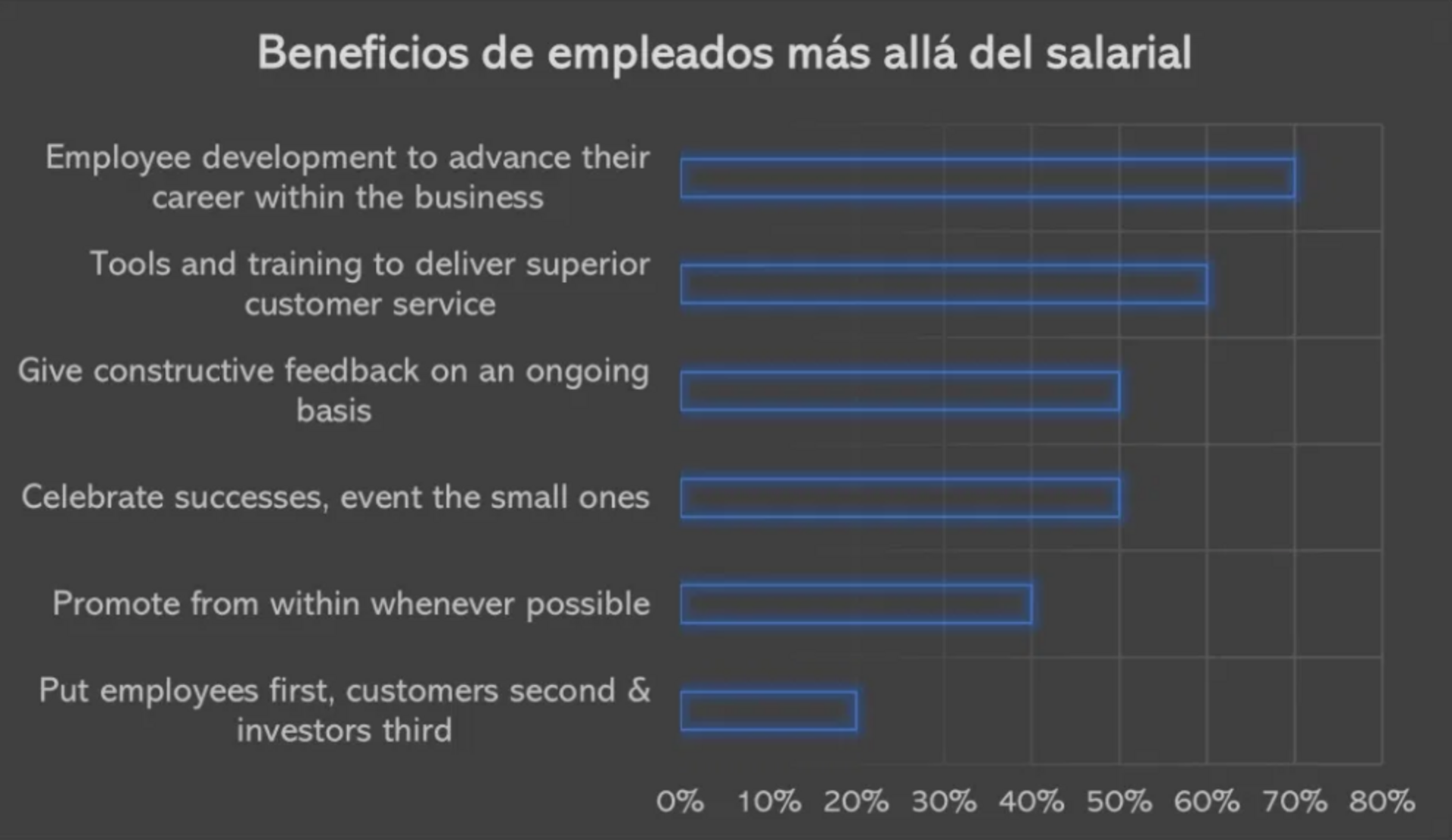 Según Press Reader, más allá del salario, beneficios para los empleados como formación y desarrollo profesional están a la vanguardia de las expectativas de los empleados. Por ello, si ofreces oportunidades de formación y desarrollo profesional, es más probable que se logre una mayor fidelización.