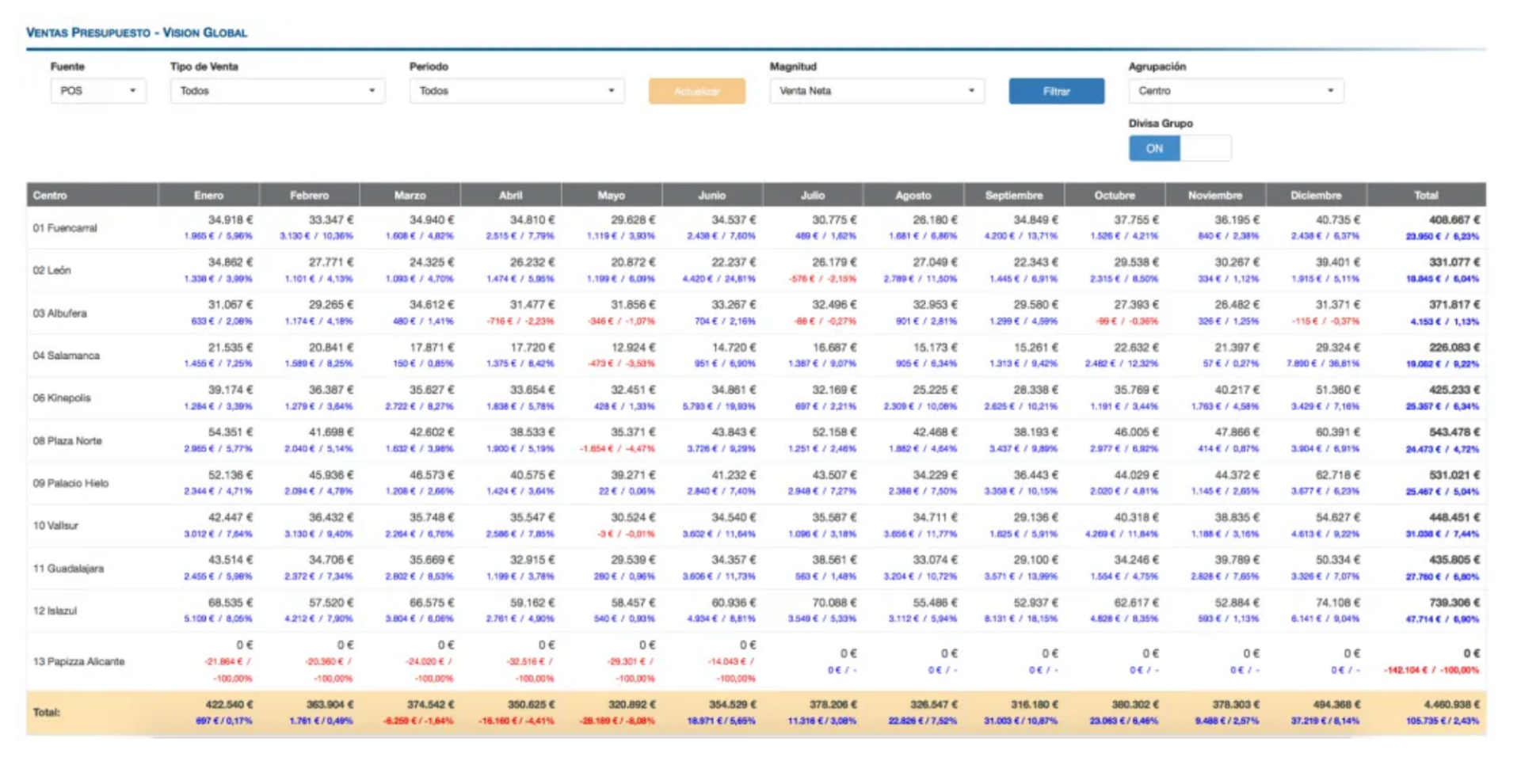 Pinchando sobre este icono se desplegará una nueva pantalla que te permitirá analizar el presupuesto agregado para el conjunto de todos los establecimientos de tu grupo: