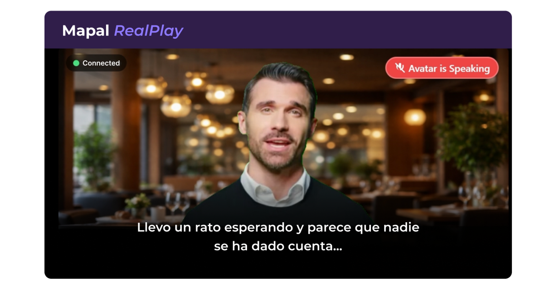 Mapal RealPlay es la nueva funcionalidad de Flow Learning que permite practicar conversaciones y situaciones reales del día a día del negocio con un avatar basado en IA.